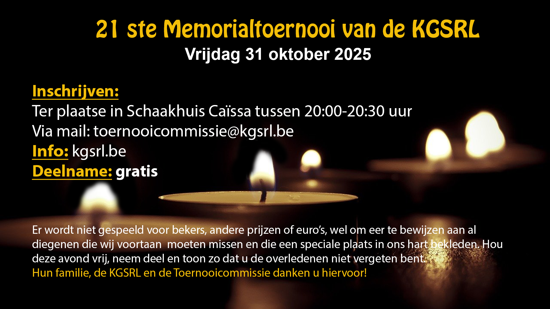 Om de overleden leden of algemeen de in 2025 gestorven schakers of familieleden van leden te gedenken en via een speciaal toernooi te eren, heeft het KGSRL Bestuur in 2005 beslist om ieder jaar rond Allerheiligen een Memorialtoernooi te organiseren.
