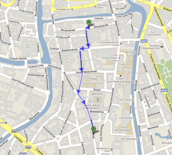From the Railroad Station Gent Sint-Pieters (A) to the Home Ter Linden (B), Sint Amandstraat 64-66: 1,5 km - 20 min.