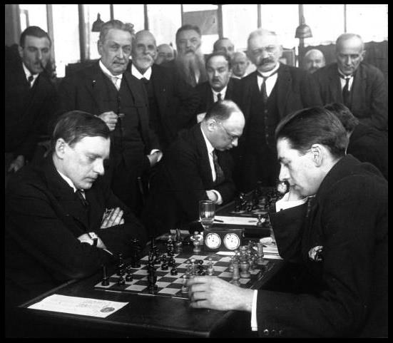 Aan het schaakbord in 1925 (van links naar rechts) Alexander Alekhine (1892-1946) en Edgard Colle (1897-1932) (foto: Wikipedia)