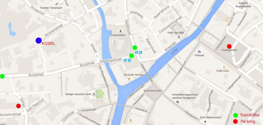 Er zijn twee openbare parkings (rode bol op map) op loopafstand, Ramen en Vrijdagsmarkt. Tramlijnen 1 en 4 (groene bol op map) hebben kortbij haltes.
