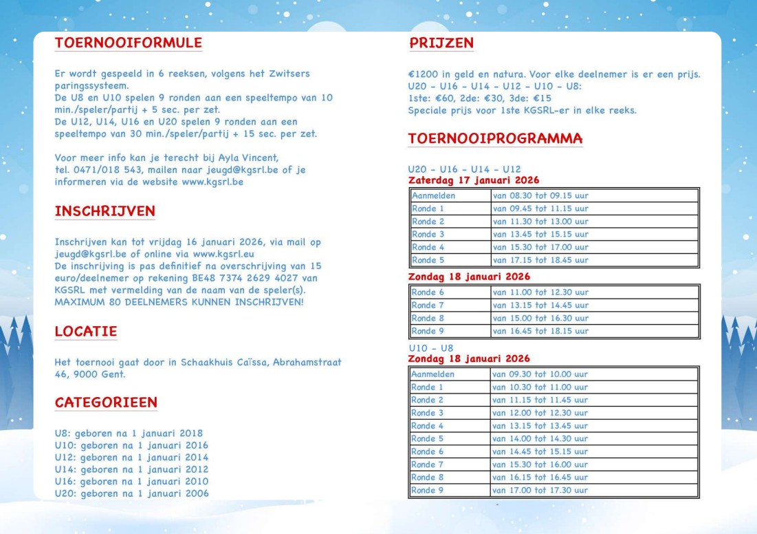 3. In de reeksen -12/-14/-16/-20 worden er 9 ronden gespeeld volgens het Zwitsers systeem. Het speeltempo is 30’ + 15”/zet.