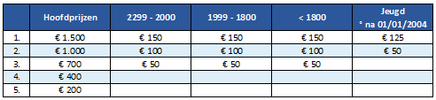 Het prijzengeld wordt berekend in functie van het aantal deelnemers, ratingprijzen voor < 1700, 1700-1849 en 1850-1999.